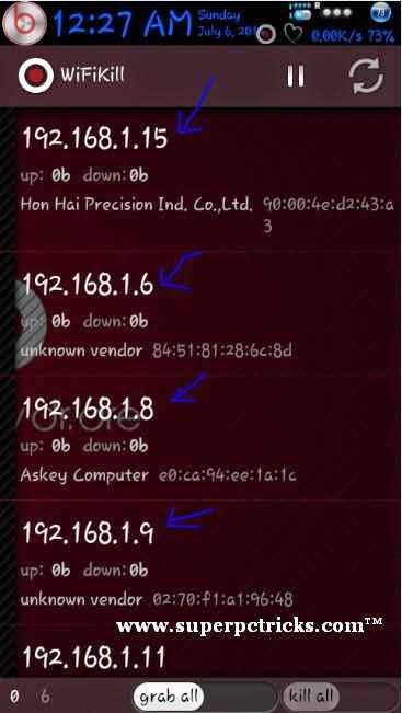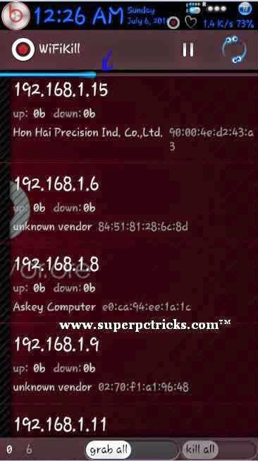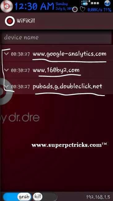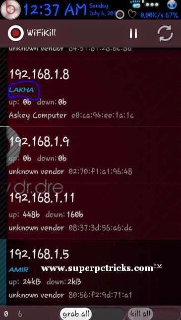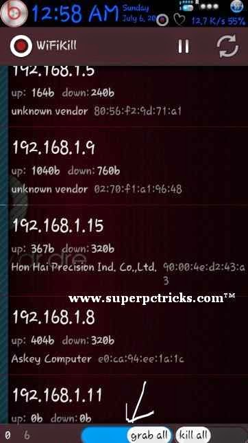 7. You can also kill all the devices at same time by grabbing them all and then killing them. You can only kill after you have grabbed a device. Grabbing the device will show you the bandwidth consumption and websites accessed by device. The device will lost the internet connectivity when you Choose to kill it.